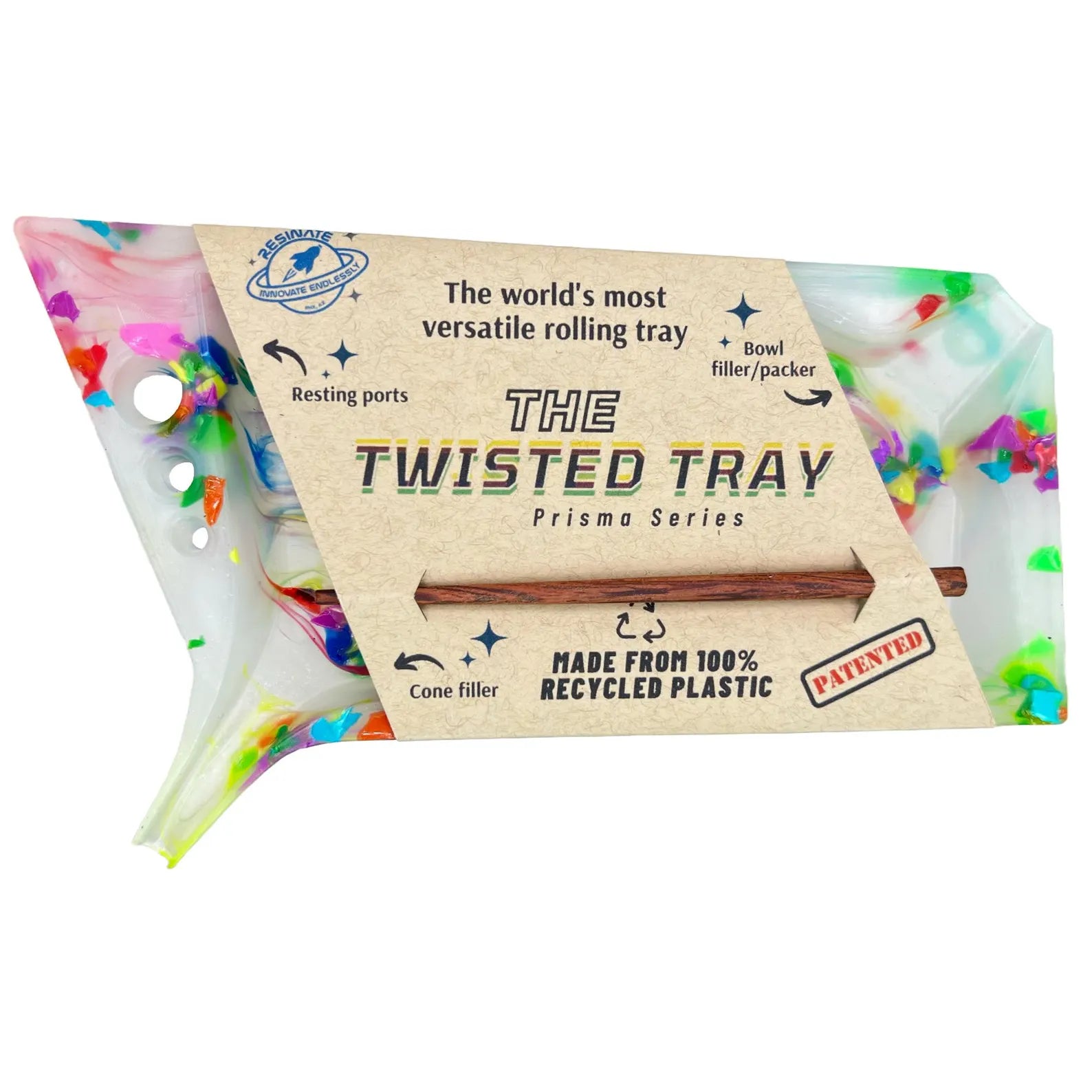We designed our patented tray with a modern yet retro-futuristic aesthetic in mind, and engineered with input and feedback from the community. The final version is perfectly engineered to help you guide material into pre-rolled cones, hemp wraps, or bowls. With the Twisted Tray, cones slide and then twist firmly onto the cone-filling spout, making the packing process a breeze. The tray resting ports can also hold your poker tool or keep rolled tips together.
