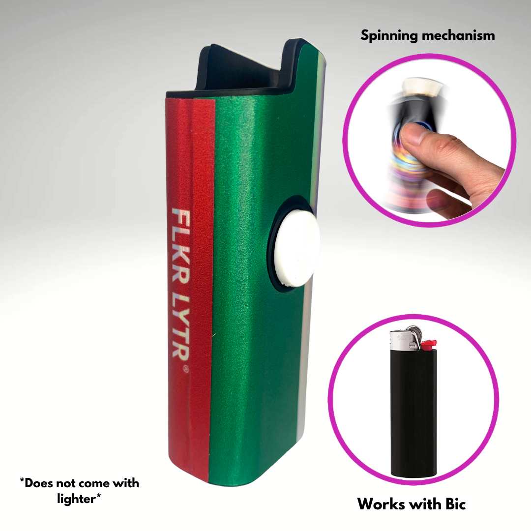 FLKR LYTR: Flicker lighter Mexican Flag! Gift you and your friend the world's first spinning lighter case- Does not come with lighter. The FLKR LYTR works with a standard Bic lighter, insert the lighter from the bottom of the FLKR and push till firm. Then Spin it, Spark it, Love it!