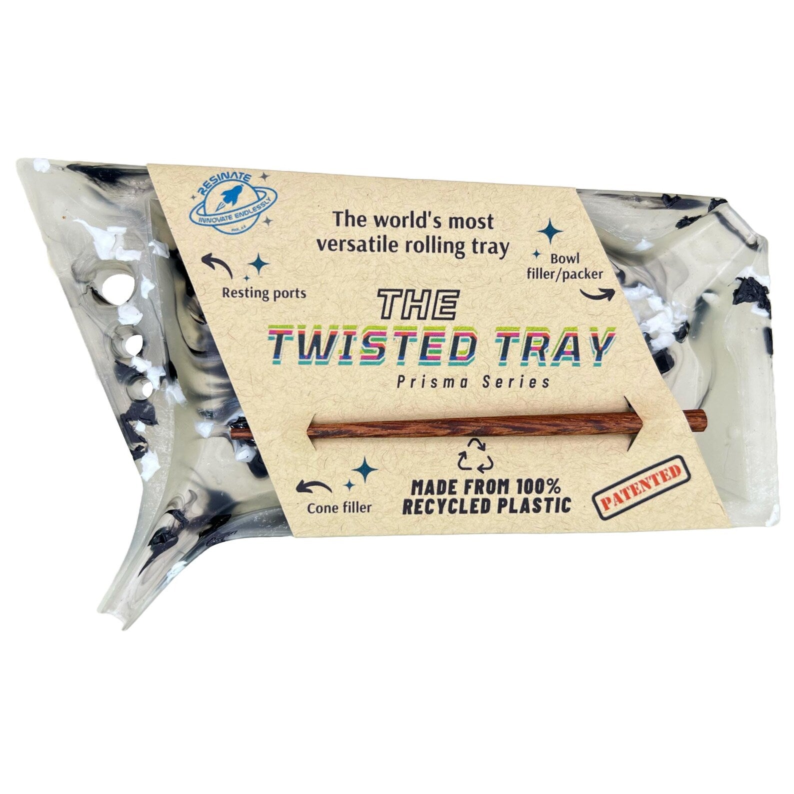 We designed our patented tray with a modern yet retro-futuristic aesthetic in mind, and engineered with input and feedback from the community. The final version is perfectly engineered to help you guide material into pre-rolled cones, hemp wraps, or bowls. With the Twisted Tray, cones slide and then twist firmly onto the cone-filling spout, making the packing process a breeze. The tray resting ports can also hold your poker tool or keep rolled tips together.